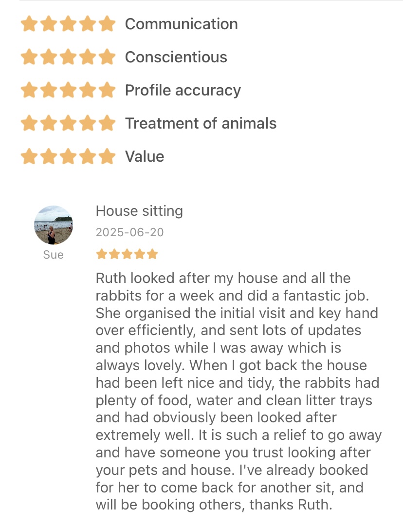 I would like to thank and recommend Ruth for dog walking. She takes out my Newfoundland who gets very excited as soon as she pulls up outside. She gives him plenty of free roaming and lead work, whatever is required and being a Newfie he likes to swim!